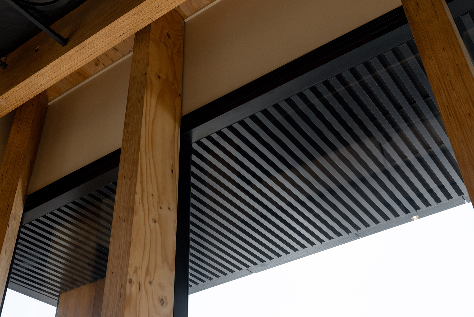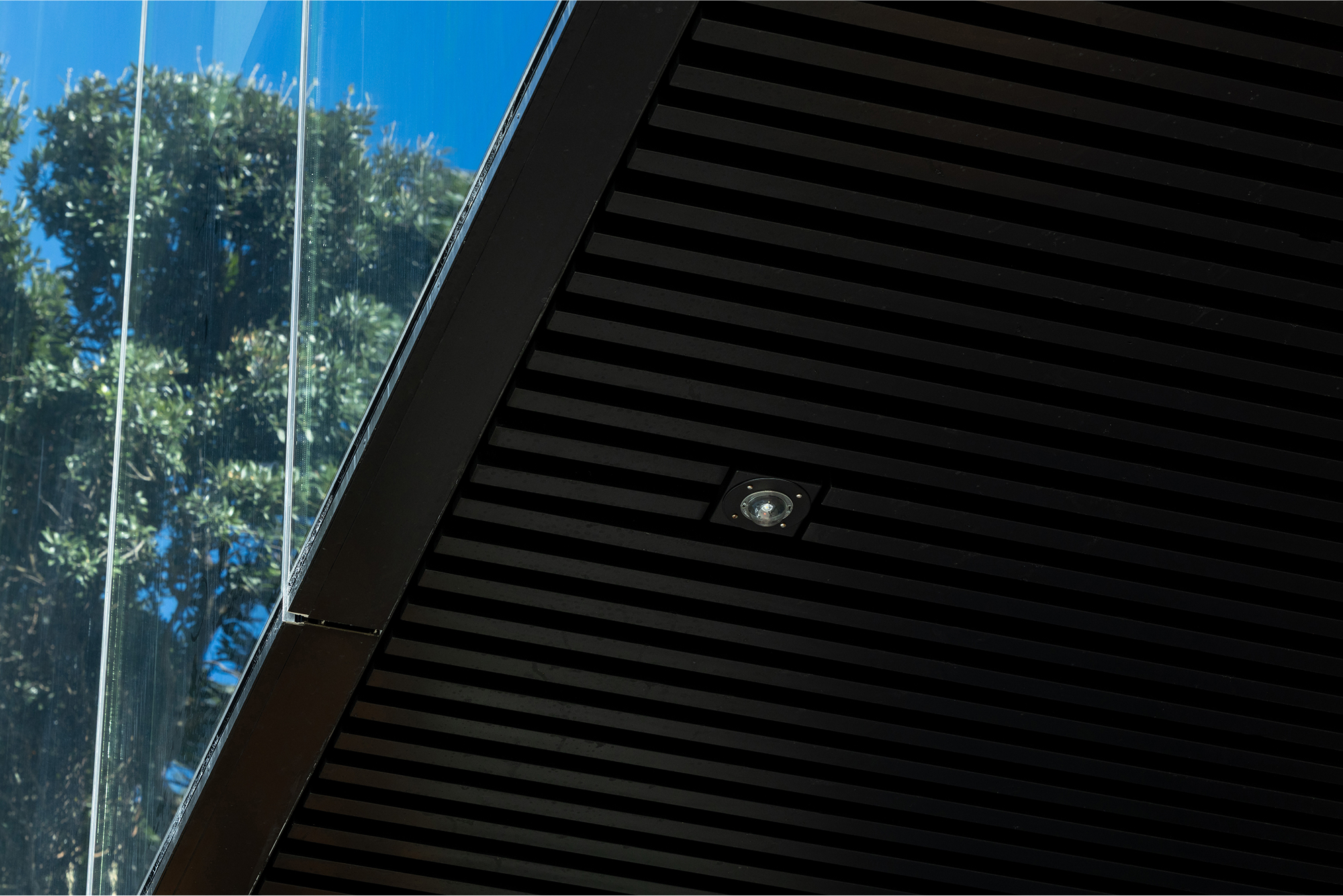 Outside, our aluminium battens (chosen for durability and weatherproof qualities) were mounted in the soffit areas, creating a bold contrast with the timber building frame.