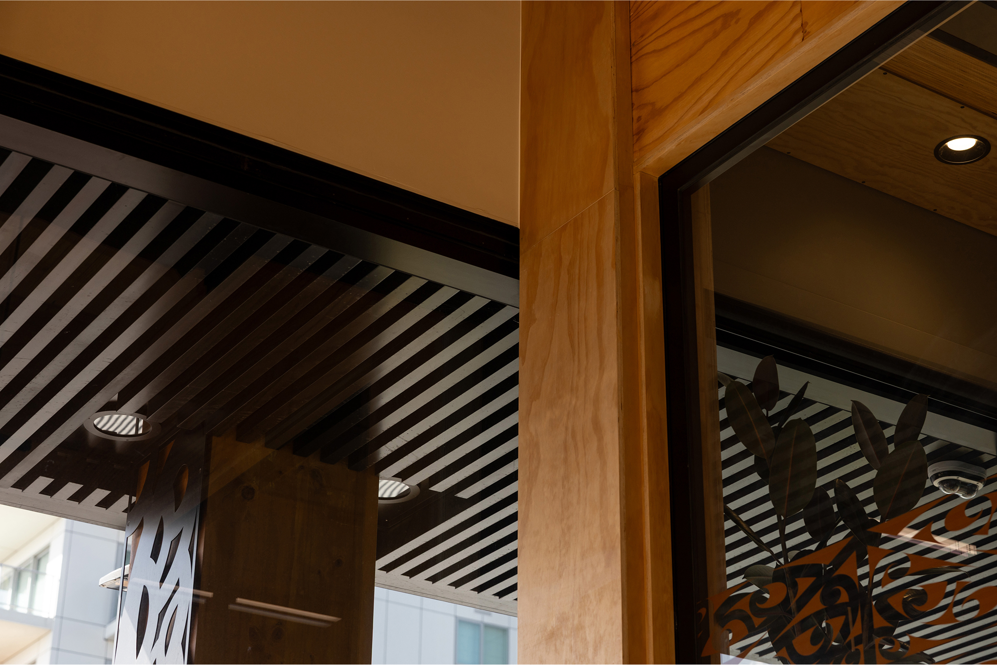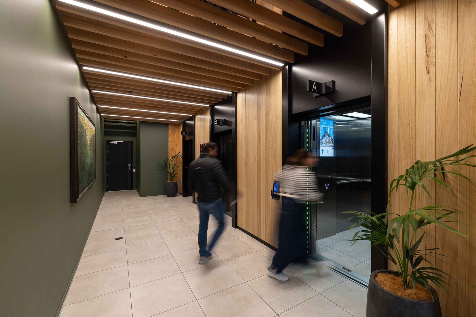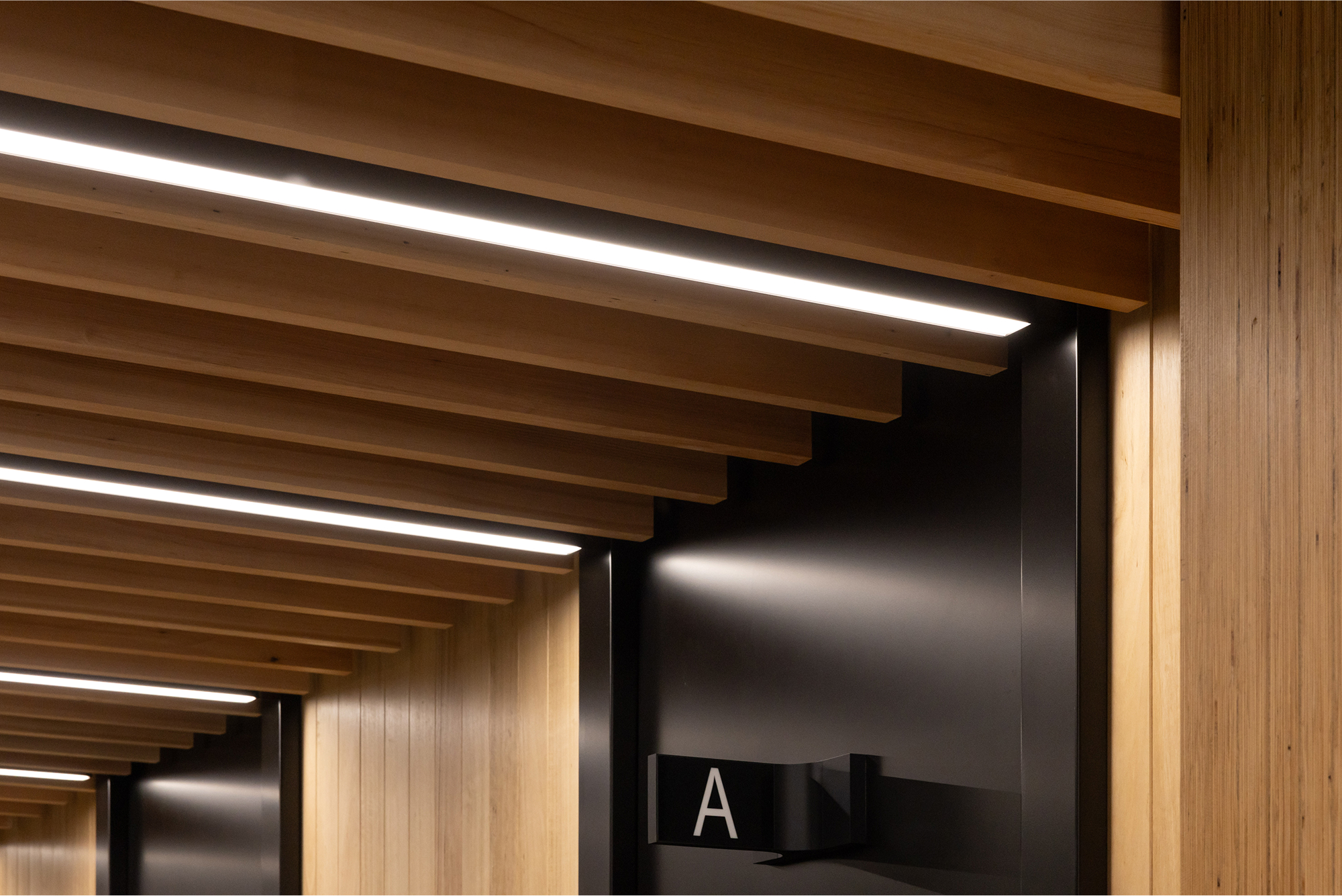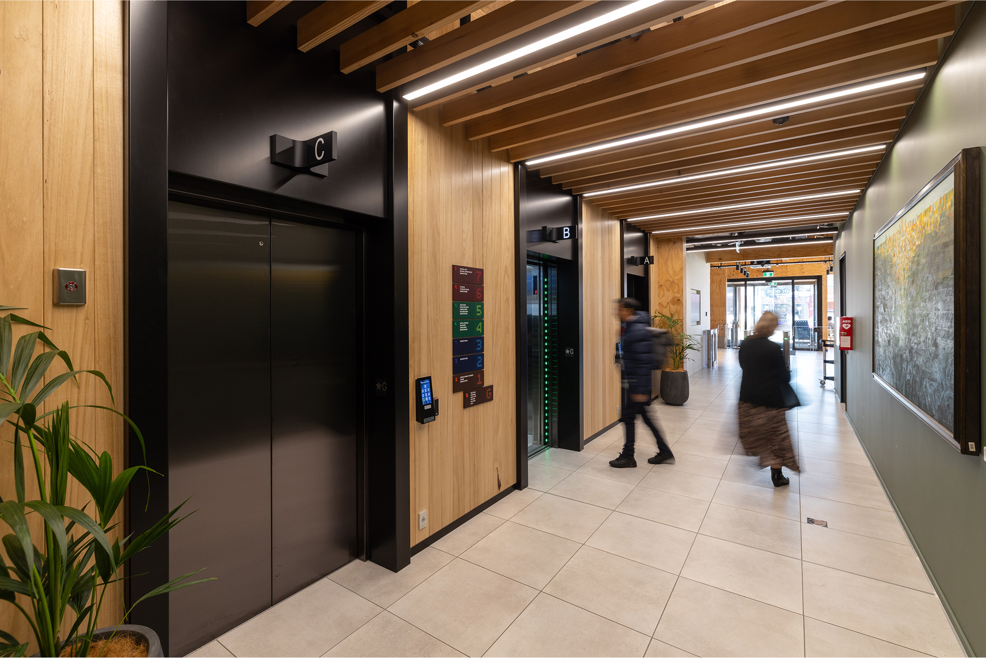 Inside, our solid Western Hemlock timber battens beautified the wind lock entrance and the lift lobby ceilings, providing a lovely colour match to the other timber surfaces.